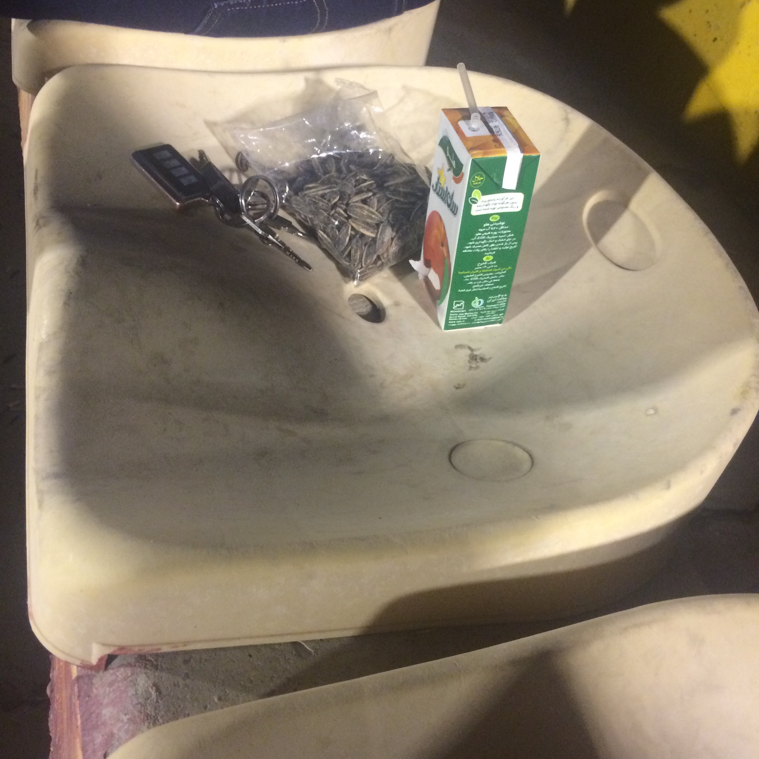 Die Gäste aus dem 2.500 Kilometer entfernten Abadan zeigten nicht nur die reifere Spielanlage, sondern fielen auch optisch mehr auf: Die Abadanis spielten in den Kanarienvogel-gelben Trikots der brasilianischen Seleccao und führten nach 45 Minuten verdient 2:0. Dementsprechend wurde im Auswärtsblock immer wieder die brasilianische Flagge gehisst und zu Samba-Rhythmen getanzt, gefeiert und den Gegner beleidigt! Und da Halbzeitbier und Stadionwurst in der islamischen Republik Iran offiziell verpönt sind, griffen wir für die Pause auf Tetra-Pack Orangensaft und Tochmeh (salzige getrocknete Sonnenblumenkerne) zurück.
