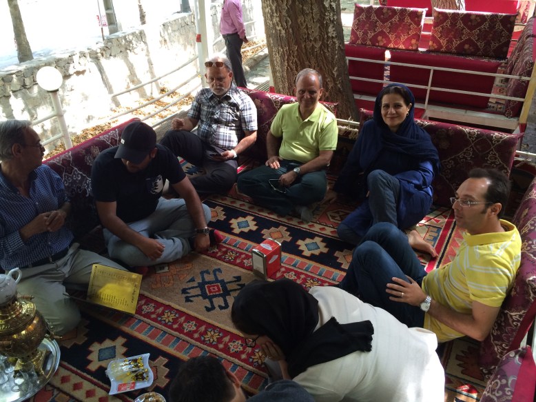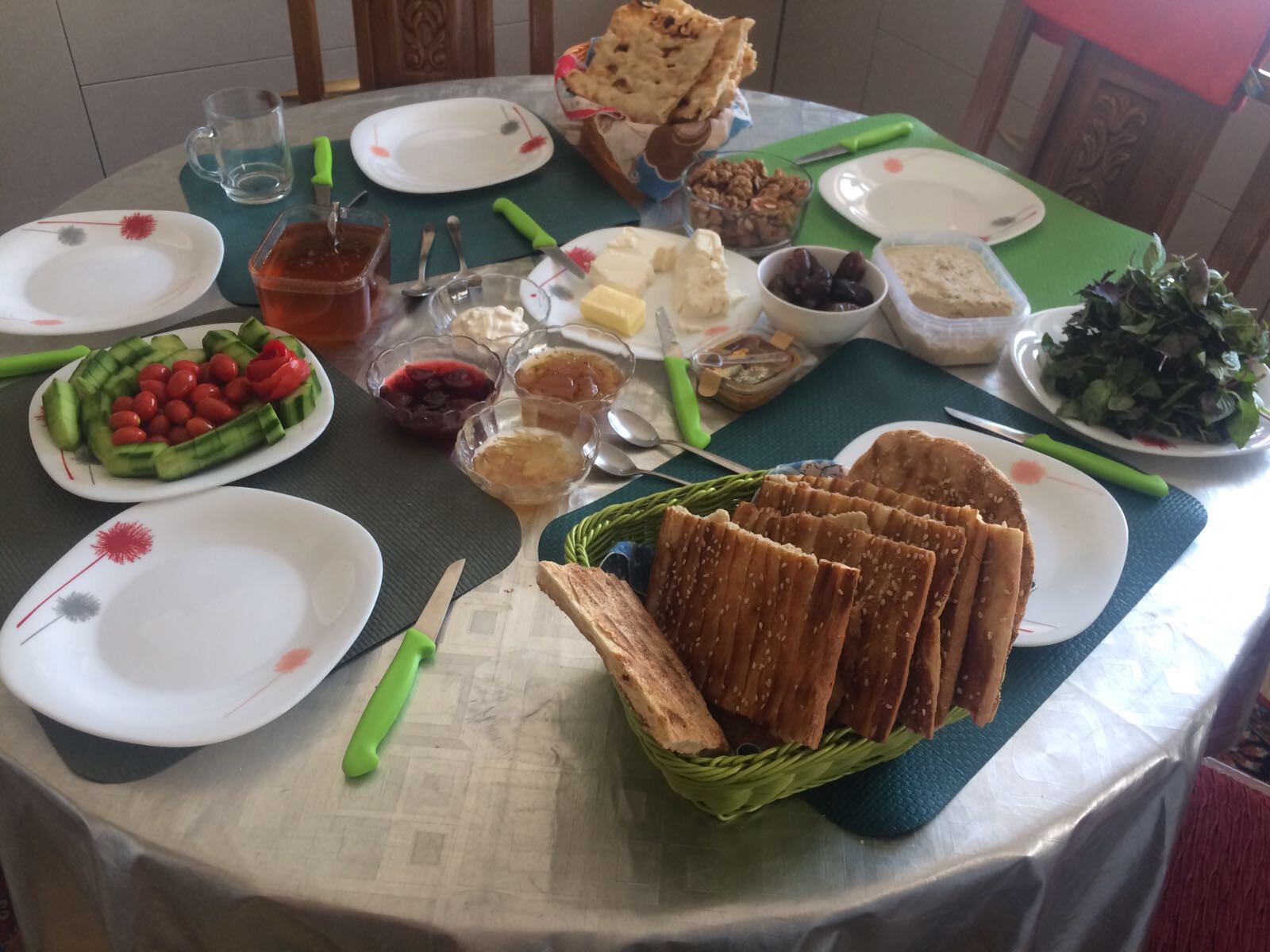 So starteten unsere ersten 12 Stunden in Iran mit viel Tee beim Onkel (natürlich wurde dazu Gebäck und Obst gereicht und nach Geschmack auch diverse Alternativen angeboten), ein kleines bisschen Schlaf, gefolgt von einem reichhaltigen Frühstück mit Tee und allerlei Köstlichkeiten (Sangak = Brot, Käse, Tomaten, Brot, Sabsi = Kräuter, Kuku Sabzi und Kuku Bademdjan = Persisches Omelett, Obst). Da wir während den beiden Anlässen bereits zu unseren Vorlieben für das persische Essen und Trinken ausgefragt wurden, stand der „Essens“-Plan für die nächsten Tage sehr schnell (bedeutend schnelller als die jeweiligen Tagesplanungen, die sich gerne auch minütlich weiter veränderten) und zumindest jeder Abend war schon mal an eine der Tanten „vergeben“ und auch die Gerichte wurden festgelegt.