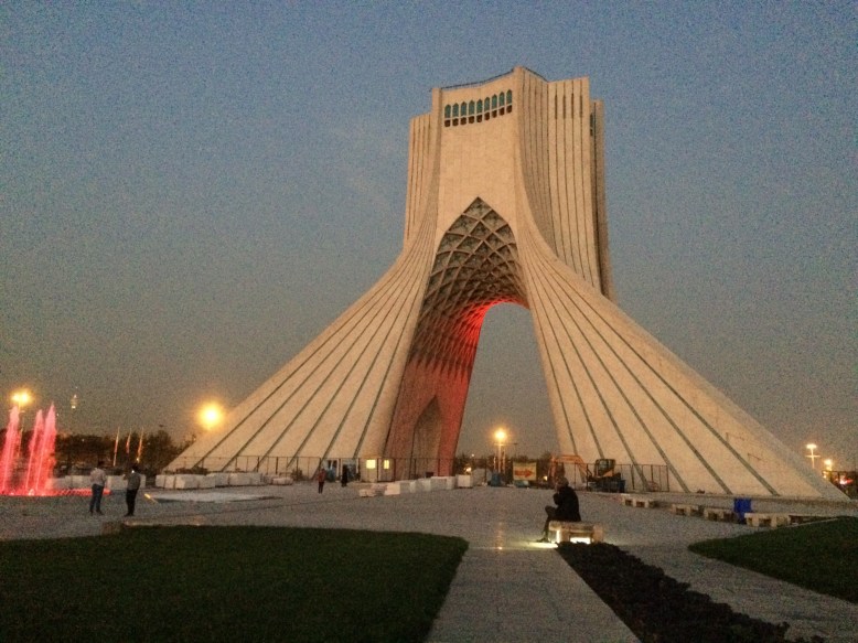 Ebenfalls die vielen Leuchtreklamen, vorrangig in den Landesfarben Grün, Weiß und Rot, flackern, blinken und werben Tag und Nacht durch. Wenn man es nicht besser wüsste, könnte man annehmen, Teheran ist die größte Partystadt im Nahen Osten! Doch anstatt Bier, Gin, Vodka & Co. gibt es hier nur Gemüse, Brot, allerlei Kebabs, Schmuck oder sonstiges. Und obwohl Teheran, was uns von vielen Seiten bereits vorab mit auf den Weg gegeben wurde, eine klassische Großstadt mit Tendenzen zu einem ‚Moloch‘ ist, strahlte diese Stadt dennoch eine große Faszination aus. Besonders lässt sich das für uns am Azadi Tower spüren, den wir an unserem letzten Tag in Teheran zur Abenddämmerung nach 2 Stunden Fahrtzeit aus dem Teheraner Norden erreichen. Dieses Monument ließ einst Farah Pahlavi anlässlich des 2500-jährigen Jubiläums der persischen Monarchie erbauen. Es verbindet Historie und Moderne sowie Okzident mit Orient. Mit dem Azadi Tower rühmte sich einst der Schah, auch die Revolutionäre von 1979 sowie die der grünen Revolution von 2009 vereinnahmten dieses Gebäude für sich.
