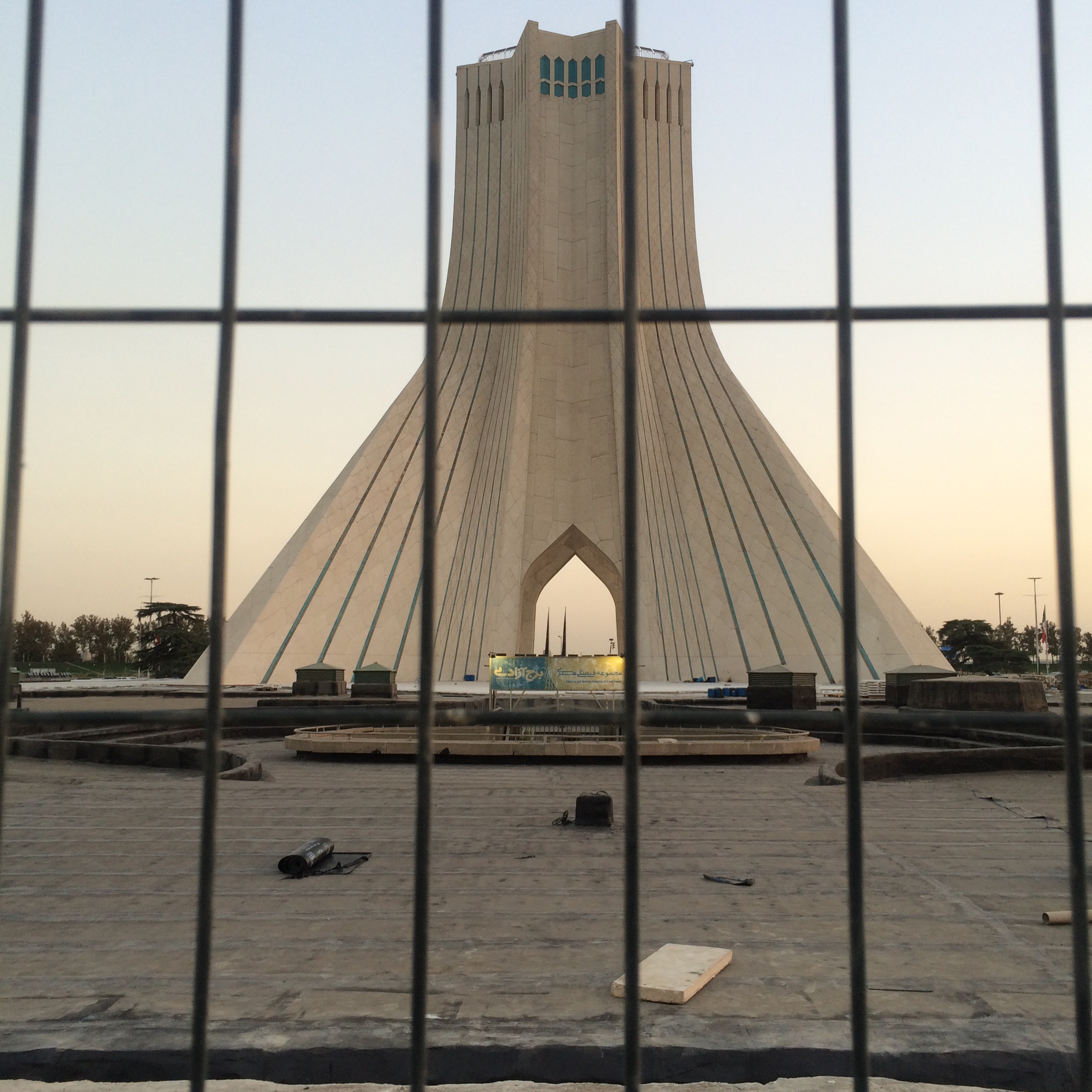 Ebenfalls die vielen Leuchtreklamen, vorrangig in den Landesfarben Grün, Weiß und Rot, flackern, blinken und werben Tag und Nacht durch. Wenn man es nicht besser wüsste, könnte man annehmen, Teheran ist die größte Partystadt im Nahen Osten! Doch anstatt Bier, Gin, Vodka & Co. gibt es hier nur Gemüse, Brot, allerlei Kebabs, Schmuck oder sonstiges. Und obwohl Teheran, was uns von vielen Seiten bereits vorab mit auf den Weg gegeben wurde, eine klassische Großstadt mit Tendenzen zu einem ‚Moloch‘ ist, strahlte diese Stadt dennoch eine große Faszination aus. Besonders lässt sich das für uns am Azadi Tower spüren, den wir an unserem letzten Tag in Teheran zur Abenddämmerung nach 2 Stunden Fahrtzeit aus dem Teheraner Norden erreichen. Dieses Monument ließ einst Farah Pahlavi anlässlich des 2500-jährigen Jubiläums der persischen Monarchie erbauen. Es verbindet Historie und Moderne sowie Okzident mit Orient. Mit dem Azadi Tower rühmte sich einst der Schah, auch die Revolutionäre von 1979 sowie die der grünen Revolution von 2009 vereinnahmten dieses Gebäude für sich.