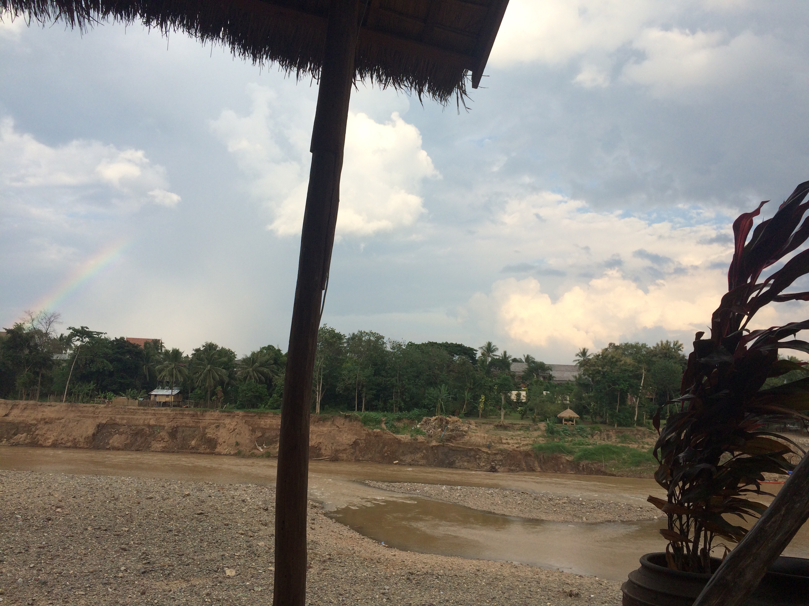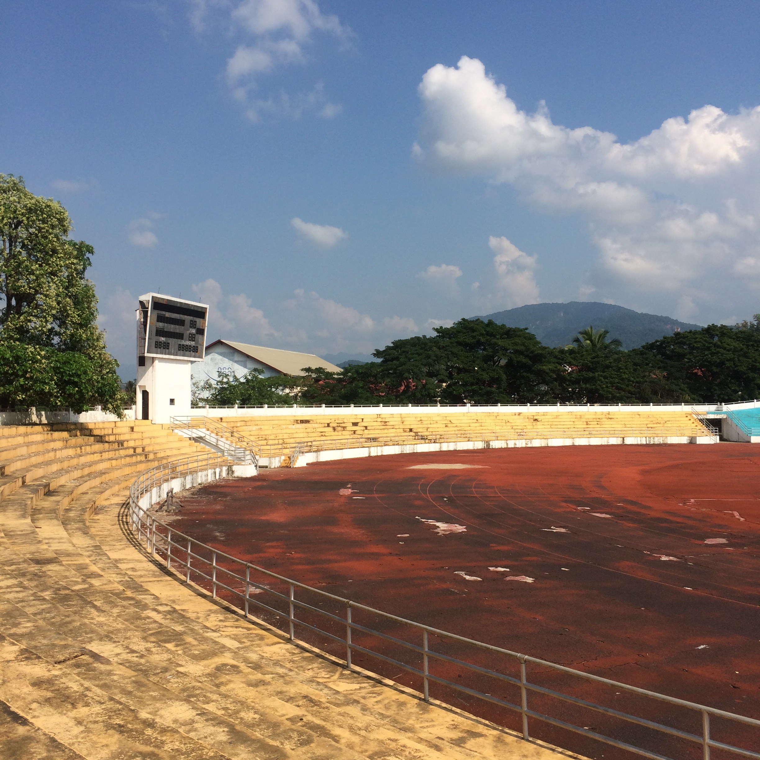 Für mich hat sich diese Stadt vor allem durchs Fahrradfahren erschlossen – barfuß auf dem klapprigen Fahrrad auf den gut ausgebauten Straßen, auf denen die umsichtigen Autofahrer (im Vgl. zu Iran und Nepal) weite Bogen um einen fahren. Selbst die Fahrt zum ca. 3 Kilometer von der Innenstadt entfernten Stade de Loungprabang verläuft vollkommen unkompliziert und entspannt – zum ersten Mal seit 5 Wochen wieder aktiver Verkehrsteilnehmer! Um ehrlich zu sein, bin ich selbst etwas erstaunt wie locker und leicht ich die Kreuzungen sowie die scharfen S-Kurven hinter mir lasse. Nach einigen ‚Abkürzungen‘ stehe ich, unweit des Stadions, schweissüberströmt in einem auf einer Anhöhe gelegenen Laotischen Wohngebiet und kann den Blick über Luang Prabang schweifen lassen: Touristen Fehlanzeige! Wenig später erreiche ich das sehenswerte ca. 11.000 Zuschauer fassende Stadion. Leider sind die Stadiontore – anders als in Kathmandu – hier nicht geöffnet, dafür kann ich das komplette Stadion mit dem Fahrrad auf einer Schotterpiste umfahren. Für Fotos klettere ich auf Steine und Zäune. Vor allem die grandiosen Kontraste zwischen sandgelben sowie türkisblauen Tribünen, den sanften, dunkelgrünen Hügeln im Hintergrund sowie den umwerfenden, weißen Laotischen Wolkenspielen am Himmel faszinieren mich und ich male mir aus, wie die Stimmung bei einem Fußballspiel sein könnte. Als ich mich auf den Weg zurück in die Innenstadt mache, nehmen mich die vor dem Stadion sitzenden Laoten schon gar nicht mehr wahr: Au revoir Stade de Loungprabang!
