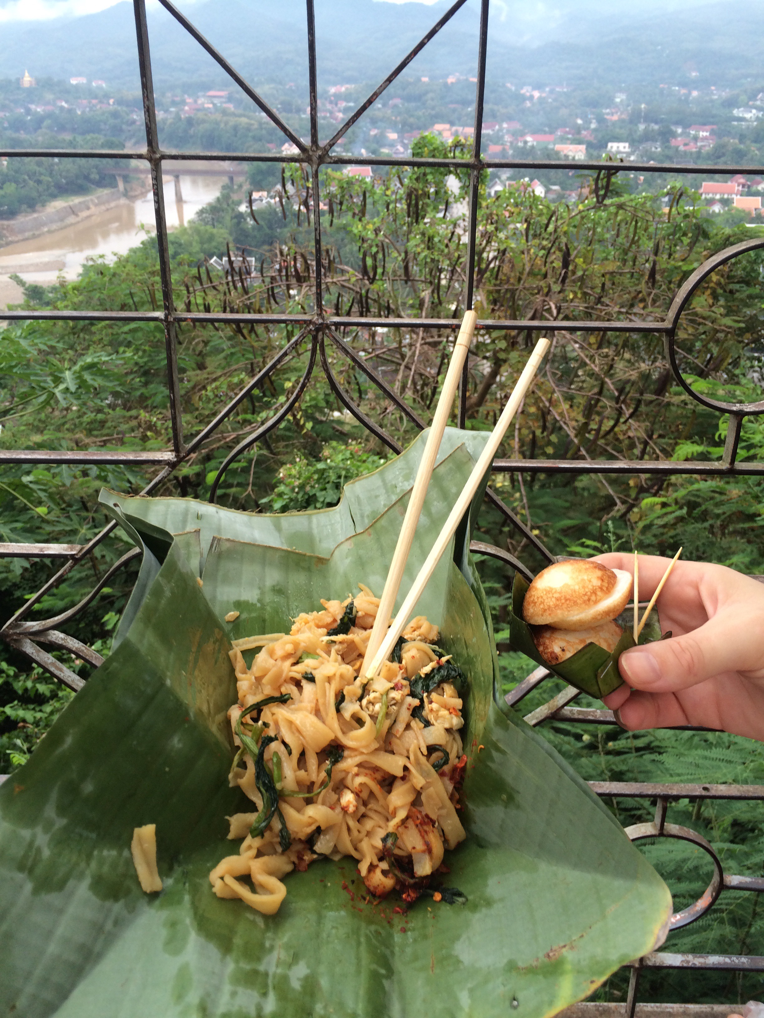 – als Alternative bei einem Frühstück auf dem Phousi-Aussichtsberg. Take Away-Essen, seien es frisch gegrillte laotische Frikadellen, gebratene Nudeln, die anstatt in Plastik-Tüten in einem Bananenblatt (Gott sei Dank!) eingewickelt werden, oder Kokos-Pancakes, scheint in Asien beliebt zu sein! Am besten stellt man sich sein asiatisches Wunsch-Frühstück zusammen, um nach über 300 Stufen Aufstieg, die 20000 Kip Eintritt kosten, auf der Spitze des 150 Meter hohen, heiligen Aussichtsberg seine wohlverdiente Stärkung zu sich zu nehmen. Und das Beste daran: während des Frühstücks kann man bereits die großartige Aussicht auf Luang Prabang genießen ohne vom Fotomarathon der anderen Touren erschlagen zu werden!