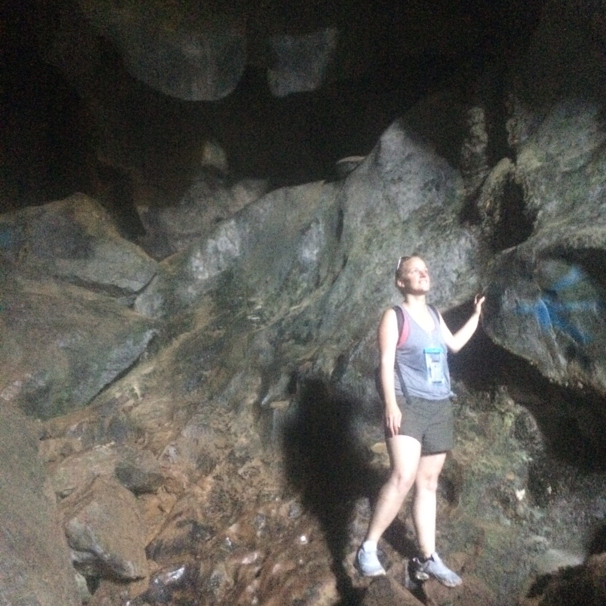Davor besuchen wir jedoch noch die für Ihren als ‚Blue Lagoon‘ bezeichneten natürlichen Süßwasser-Pool bekannte Pu Kham-Höhle! Den Pool, obwohl wir ihn durchs Radfahren verdient hätten, lassen wir aus. Wir begeben uns recht schnell in die große und vor allem nach ca. 50 Meter Abstieg vollkommen finstere Tropfsteinhöhle! Nur mit unseren Taschenlampen bahnen wir uns den Weg durch die dampfige, dunkle und rutschige Höhle: Sicherungen, Absperrseile, Wegweiser Beleuchtung – Unbekannt! Nach 1 Stunde erblicken wir endlich ziemlich durchgeschwitzt, aber glücklich wieder Tageslicht!