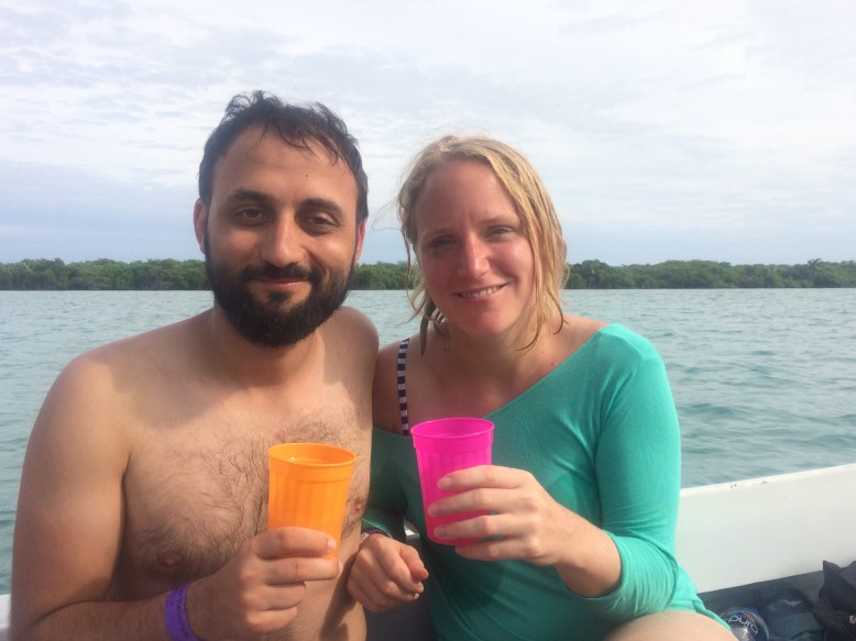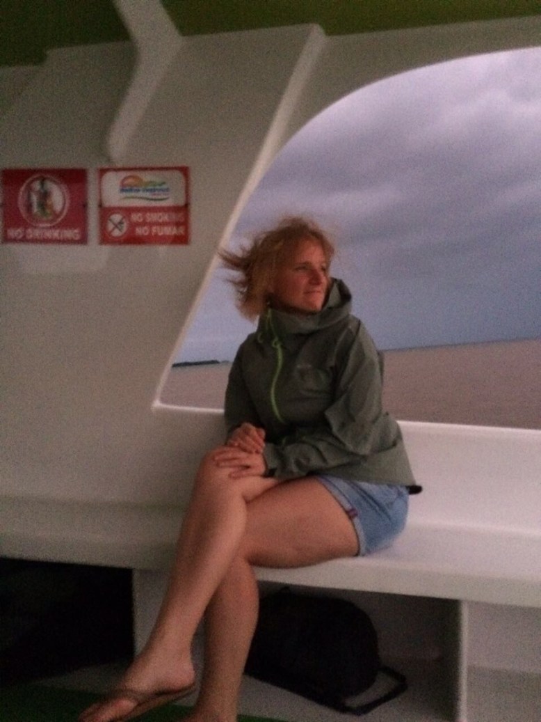 Von dort aus machen wir uns direkt auf den Weg nach Caye Caulker. Die kleine Insel ist als Backpacker-Paradies bekannt und auch darauf ausgerichtet. Im Sonnenuntergang nehmen wir die Fähre und geniessen die rumpelige einstündige Fahrt bei heftigem Wind und entsprechendem Seegang sehr! Begleitet werden wir auf dem Oberdeck von einem jungen Einheimischen, der sich ebensowenig von den Wetterverhältnissen beeindrucken lässt und stattdessend im Sitzen tanzend seine Musik genießt.